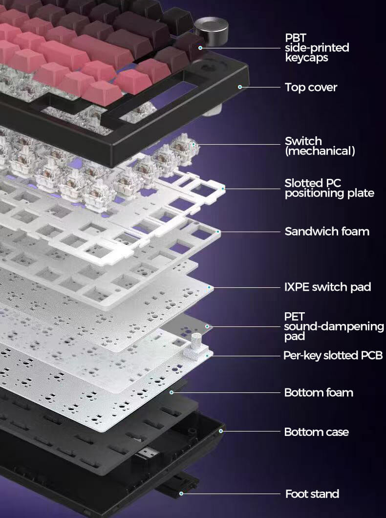 PC Positioning Plate: Reduces typing noise, provides a more comfortable keystroke, and enhances light transmission for brighter, more uniform illumination.